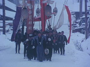 長野県阿南町新野の伊豆神社と諏訪社を中心に13世紀頃から続く「新野の雪まつり」の記録。冬に舞い落ちる雪を稲穂の花に見立て、実りの先触れとして五穀豊穣を願う。夜を徹して行われる祭では「きょうまん(競馬)」「翁」などの仮面仮装の芸能が次々と行われ、実りをもたらす精霊「さいほう」の登場に場が沸き立つ。来る一年の生産に向けた農民の日常(ケ)の願いを、ハレの祭りの中に読み取ろうとした作品。