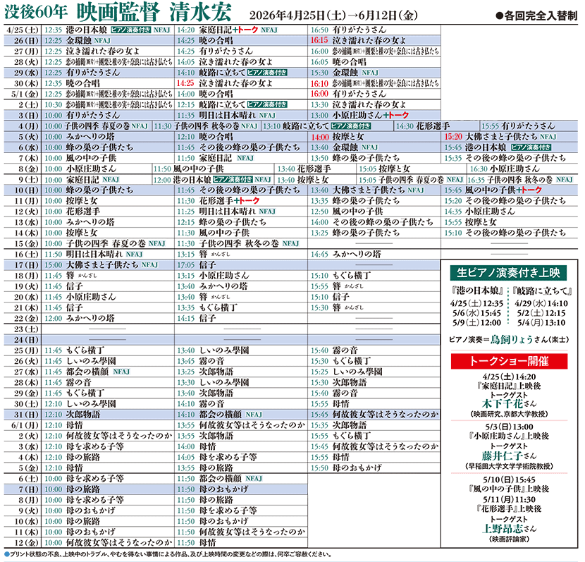◆戦後は一時映画界から退き、戦災孤児たちを引き取って共同生活を送るが、彼らと独立プロダクション「蜂の巣映画部」を設立して映画製作に復帰、『蜂の巣の子供たち』(1948年)は大きな社会的反響を呼んだ。「蜂の巣三部作」の後、新東宝・東宝・大映に呼ばれて児童映画や母もの映画なども多数監督。撮影所全盛期の監督でありながら、いち早く撮影所を飛び出した独立映画作家でもある清水宏。その映画世界は、1990年代から再評価が進み、自由な映画精神、独特の移動撮影と天衣無縫な演出が、新たな「発見」と感動で注目され続けている。当館では、2014年に清水生誕110年を祝って開催した特集上映(28本上映)に続き、今回没後60年を記念して前回を超える33作品を一挙上映。1925年の『恋の捕縄』(断片)から1959年の遺作『母のおもかげ』まで、貴重な国立映画アーカイブ作品も集めた、映画館では最大規模の特集上映となる。ぜひお楽しみください!