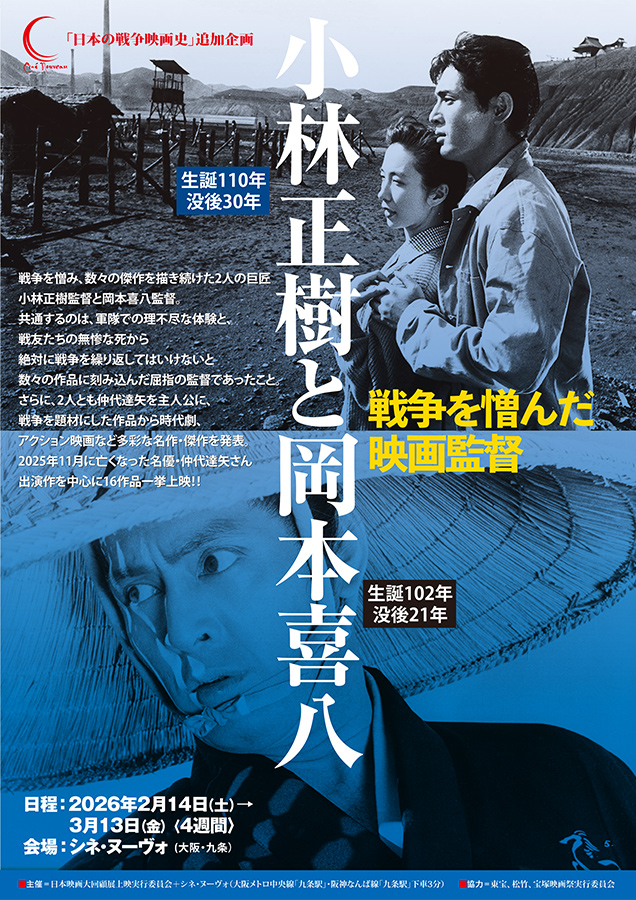 戦争を憎み、数々の傑作を描き続けた2人の巨匠、小林正樹監督と岡本喜八監督。生誕110年・没後30年を迎える小林正樹監督は、1941年に松竹に入社、その翌年26歳で出征し『人間の條件』の舞台であるソ連国境の満洲ハルピンに配属。その後、南方へ移動し、宮古島で終戦。捕虜収容所に収容され、翌年復員。8歳若く生誕102年・没後21年の岡本喜八監督は戦争末期に大学を繰り上げ卒業させられたあげく1945年1月に21歳で陸軍士官候補生として徴兵され、特攻訓練の日々、多くの仲間たちの死を目の当たりにする惨状を経験。そのあまりに悲痛で地獄図のような戦争体験の中、そんな戦争を個人に課した国家への強い怒りとなり、2度と戦争を繰り返してはならないという二人の厚い信条となった。作風は、個人の意志の重さを描き続け、「完全主義者」といわれた強靱な映画世界を創った小林に対し、ナンセンスで奇想天外、また脱・日本映画風の軽妙さが魅力の岡本と、その個性の違いがまた映画ファンを魅了した。その異なる2人の数々の傑作に出演したのが、2025年11月に亡くなった俳優の仲代達矢。個性の異なる2人の巨匠に愛され、多彩な役柄を演じきった稀代の名優の作品を中心に、16作品を一挙上映する!!